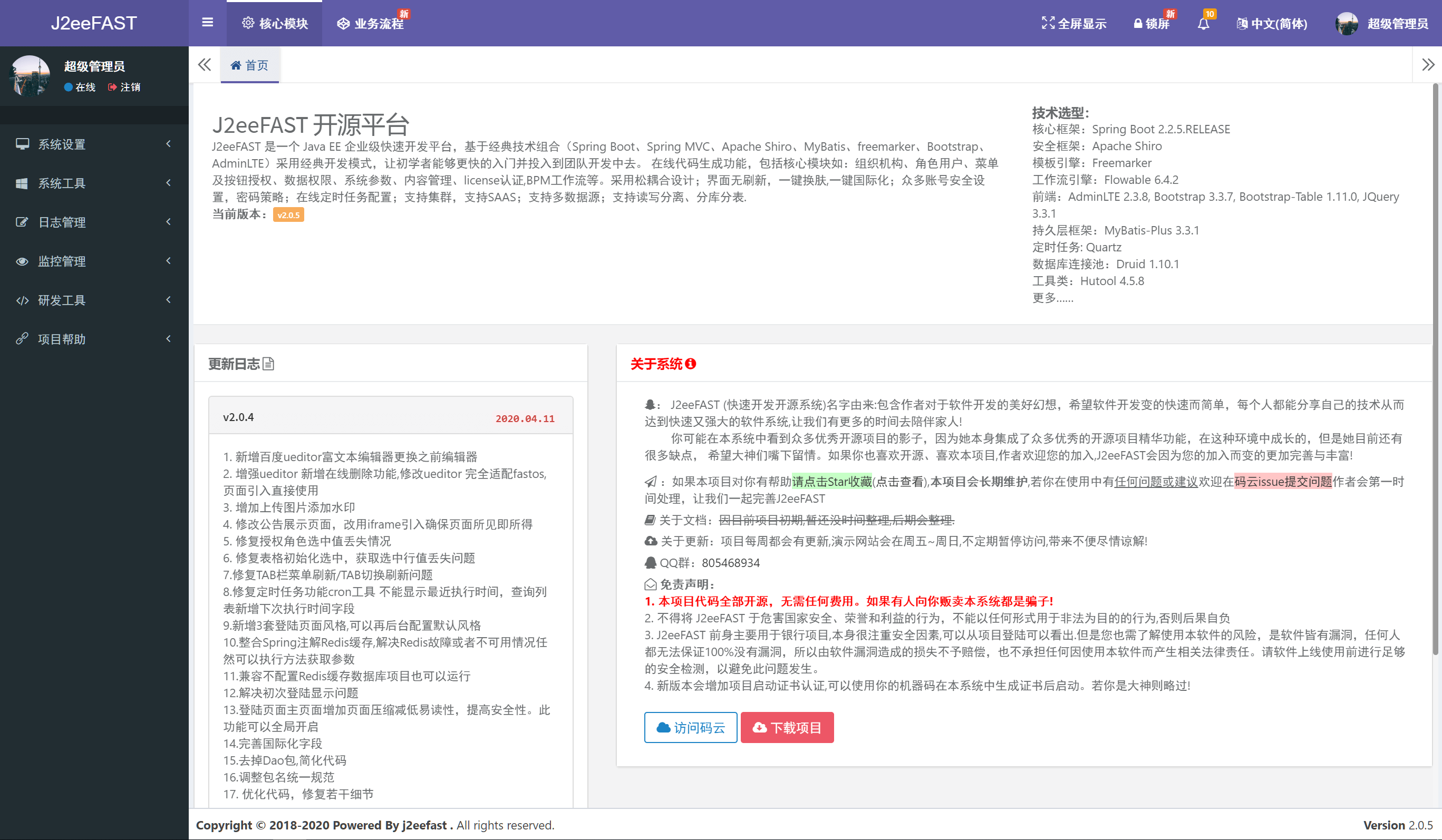 J2eeFAST 源码100%开源 注释详细,便于阅读。代码无后门,可放心使用。提供丰富的插件、接口,易于扩展,提供完善文档,积极响应反馈问题,技术交流群。