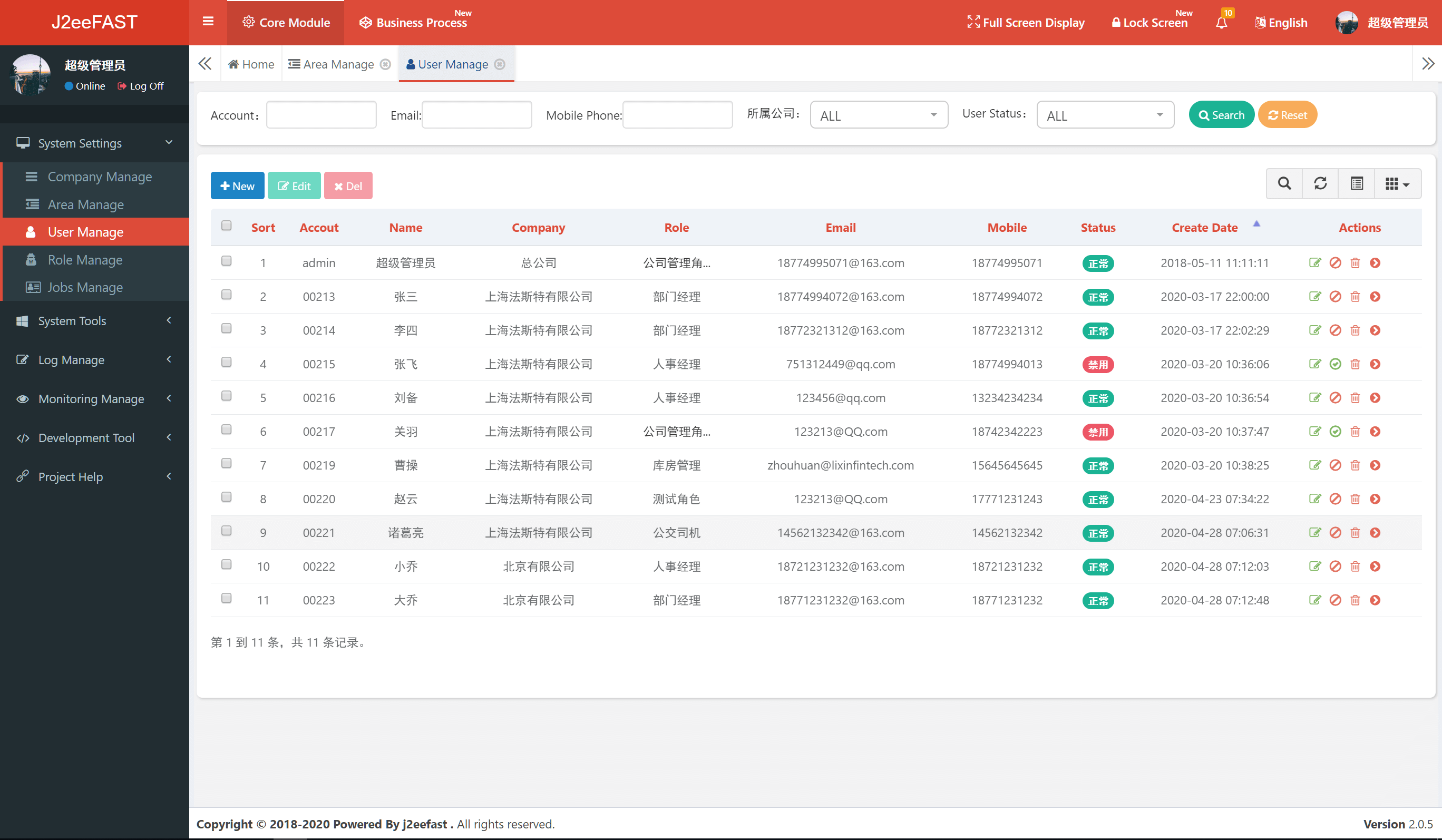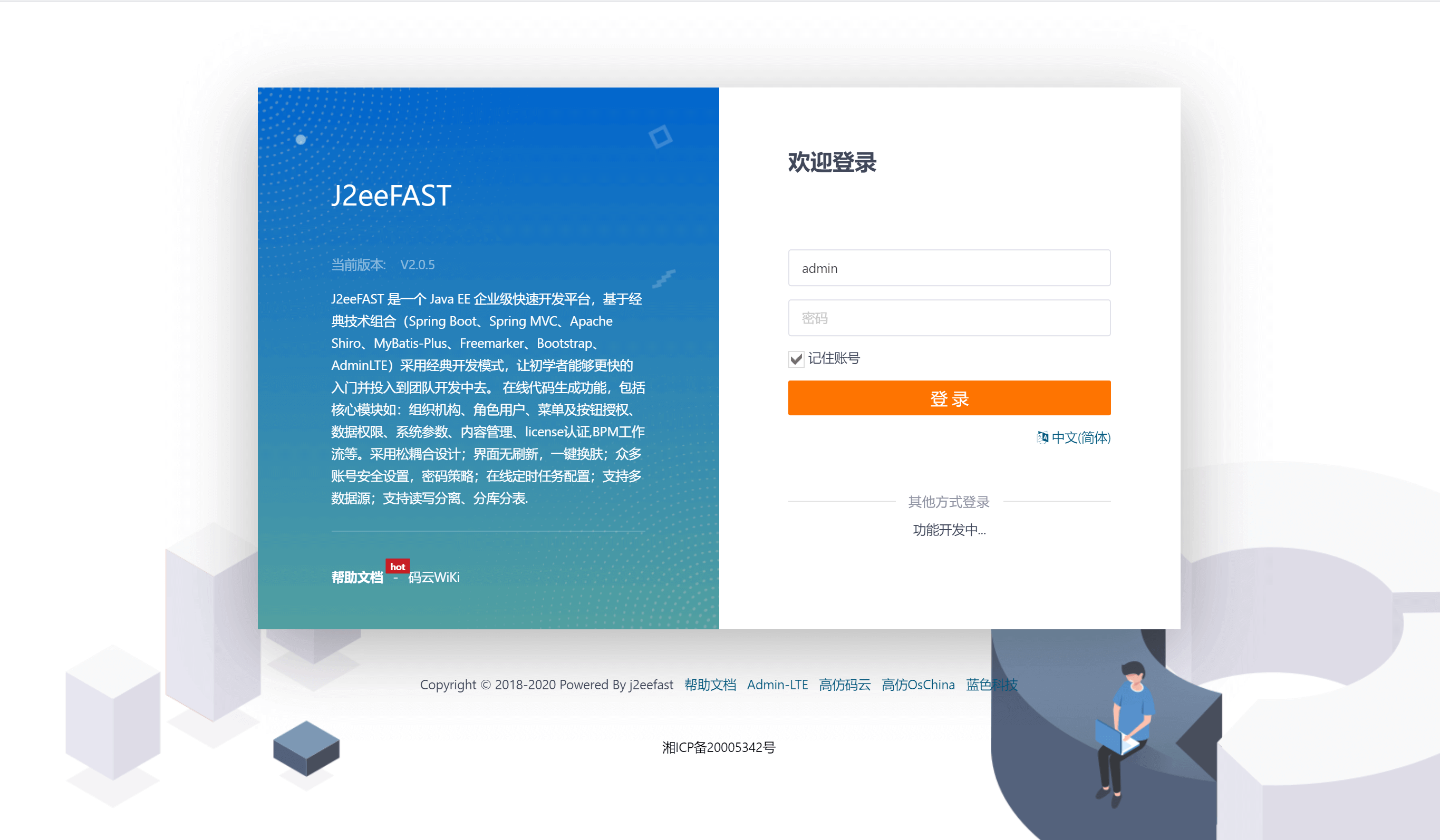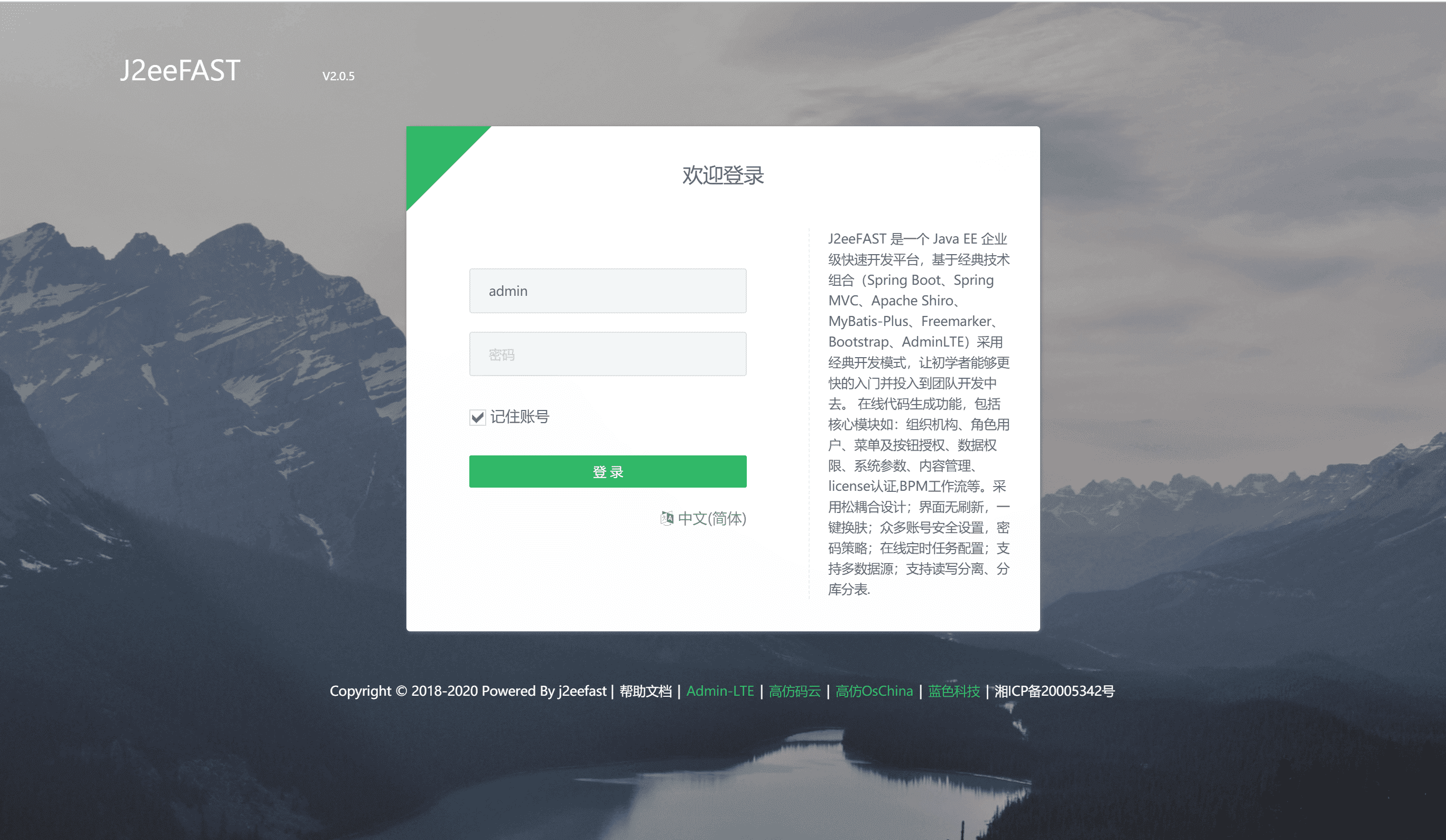 J2eeFAST 基于 Spring Boot 2.X + MyBatis-Plus 3.3.1 + Apache Shiro + Redis + Freemarker + Flowable 6.4.2, 前端采用 jQuery + Bootstrap 实现,采用了'扁平化、响应式'的设计风格,可以完美兼容电脑,平板,手机等多个平台; 让你用经典开发模式,快速开发