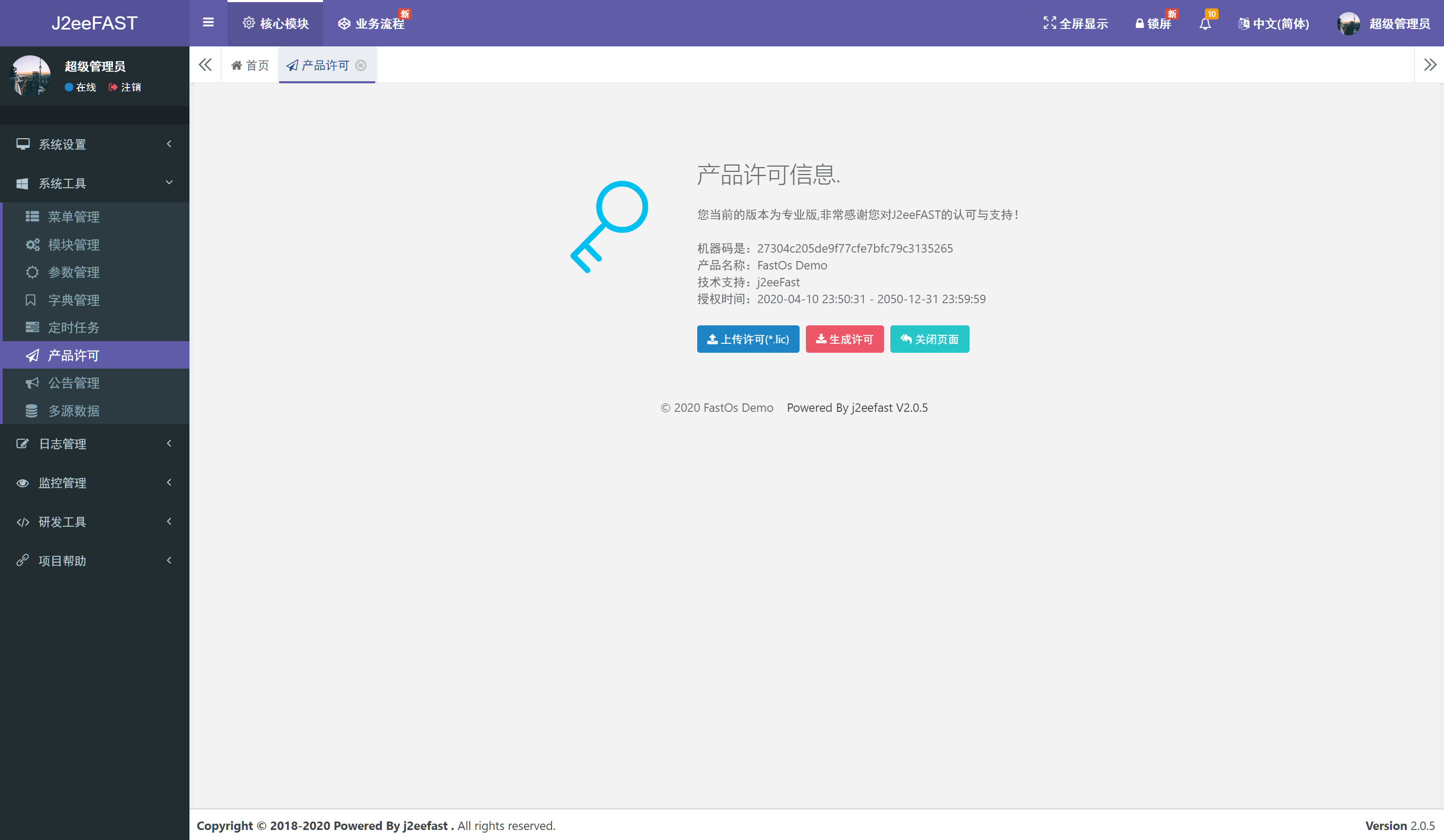 J2eeFAST 虽然免费开源,但也不影响她对代码的保护、防止盗版、加固项目安全性。提供JavaJDK 自带Keytool生成系统密钥与证书为我们系统提供安全保障,系统会为每台机器生成唯一的机器码,提供密钥对机器码生成注册码。可以对软件的运行、授权时间、过期时间、拷贝运行等诸多要素进行控制从而达到保护我们的软件的目的