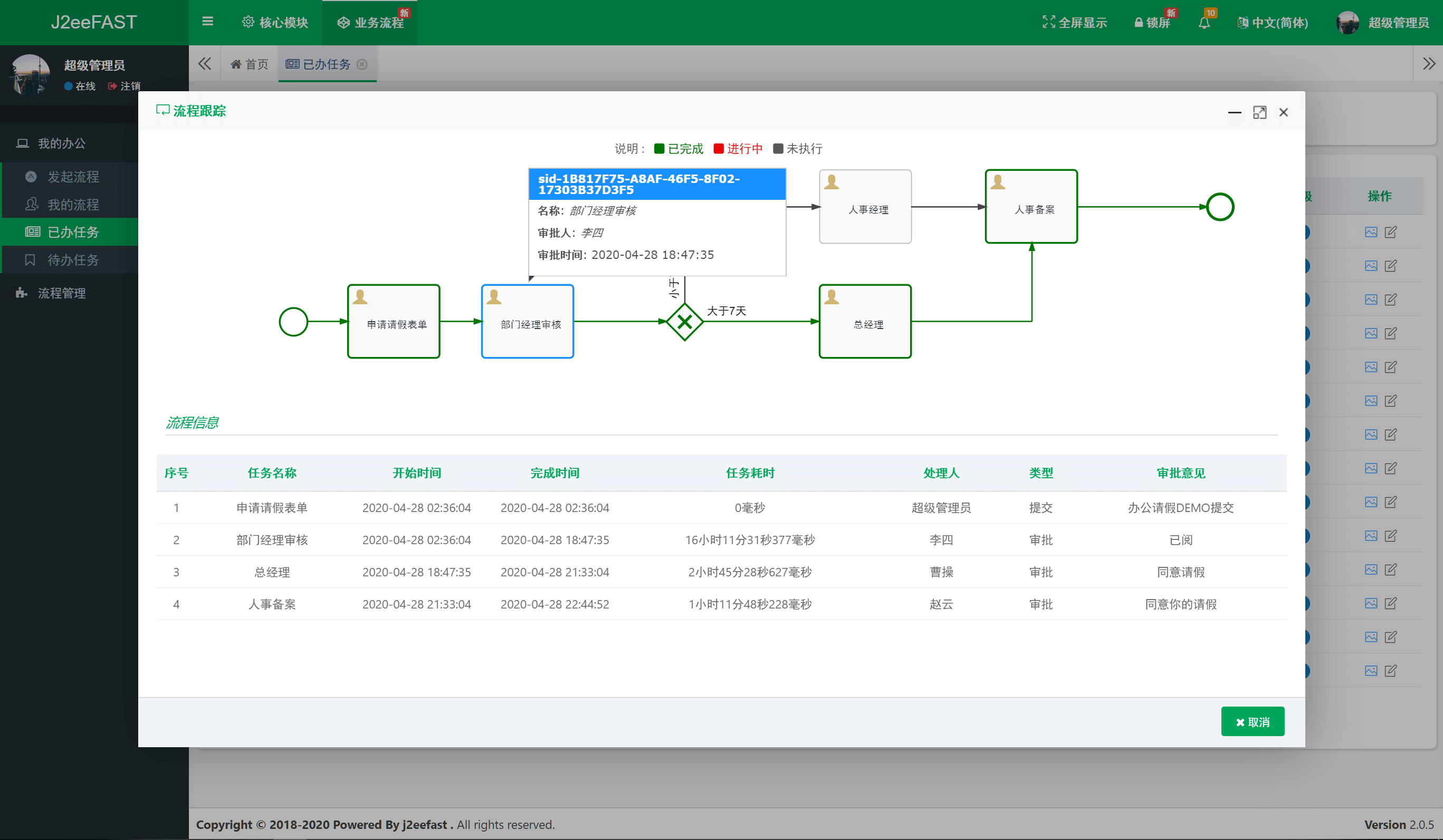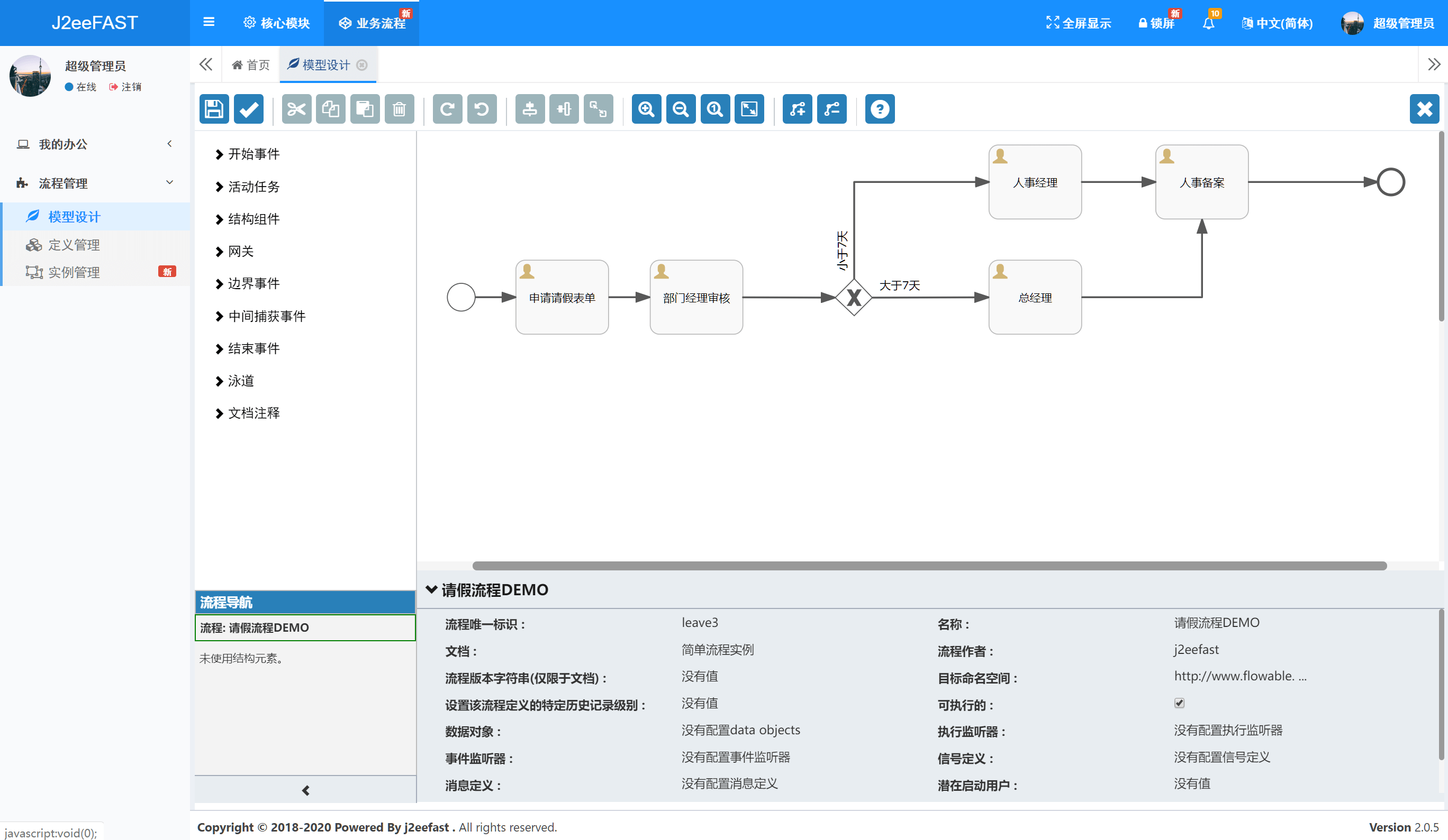 完善的工作流模块分库管理,基于Flowable 生来具有稳定的工作流引擎,一系列智能化封装极大简化BPM工作流的开发。 通过流程在线设计器在线画流程、在线配置表单、你只需要关心表单的设计.J2eeFAST 通过Rabbitmq 实现核心业务用户权限与Flowable 用户权限同步处理、无需改动Flowable表结构无需增加视图,Flowable升级灵活,对业务没有任何影响!